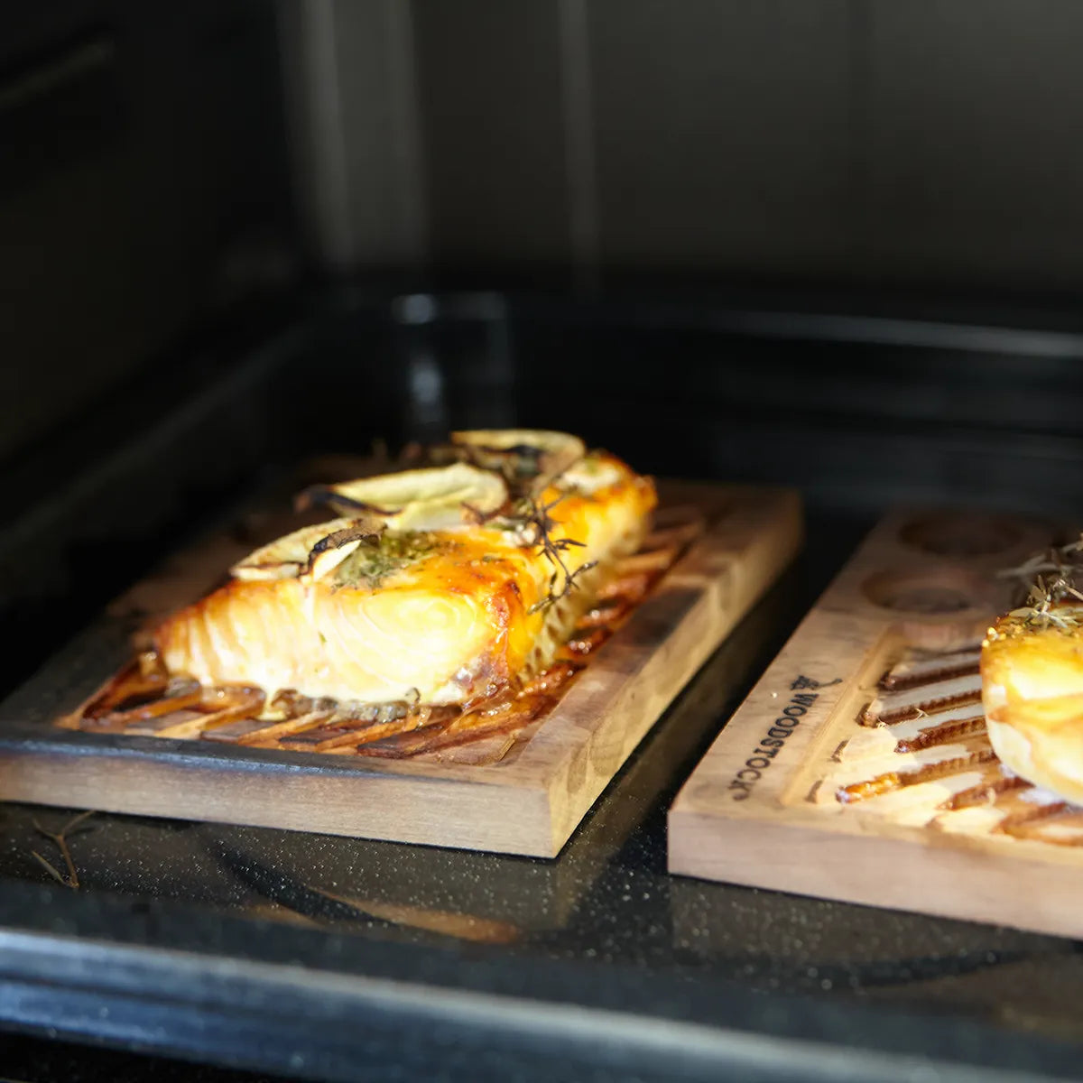 スタッフの体感として、魚焼きグリル>オーブンレンジの順で調理がしやすい印象です。もちろんご家庭に通常のオーブンがある場合はそちらがおすすめ。特にアルミホイルを被せた場合、魚焼きグリルの方が火力調整と食材に火が通しやすいですよ。ご家庭での料理の場合は火力調整のおかげで板が完全に燃えて炭化することが少なく、洗っていただければ繰り返し使っていただけます。